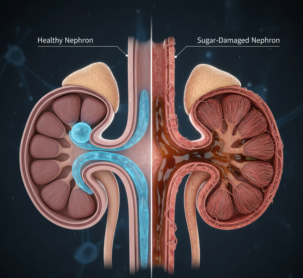 - Nephron Loss: When sugar forces the filters into overdrive, they begin to die off. Critically, once nephrons are gone, they do not grow back.